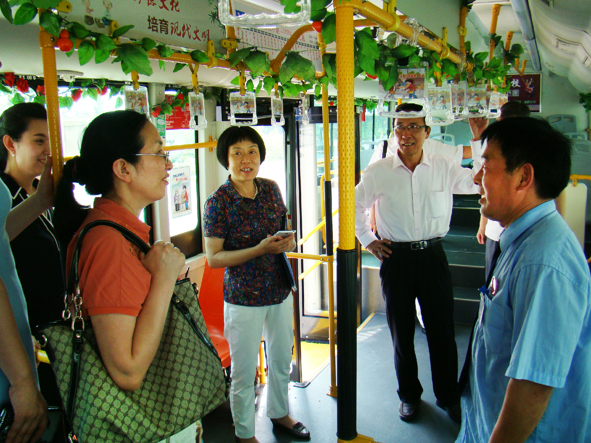 為有效提高老年人乘車安全系數(shù),公司為14路線在車廂內(nèi)設置“老幼病殘孕”愛心專座的基礎(chǔ)上,專門設置了“敬老專座”; 為了給老年乘客提供優(yōu)美的乘車環(huán)境,還在車廂的頂部和前部放置各種綠色植物和鮮花,同時,在駕駛座后面安裝了便民袋,配備常用藥物、老花鏡、針線包、意見簿及公交乘車指南、報紙、老年人專用雨披等物,讓老年乘客登上公交車,就能感受到清新氣息。