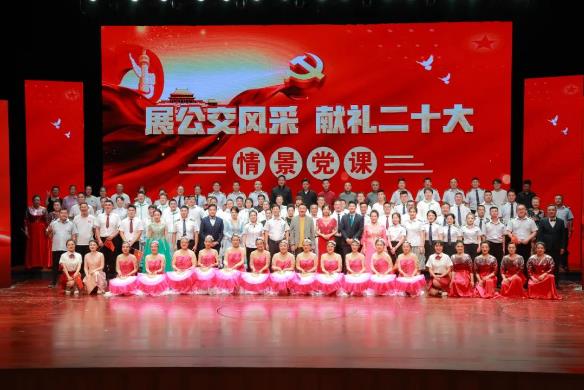 為激勵(lì)廣大黨員群眾以實(shí)際行動(dòng)迎接黨的二十大勝利召開(kāi),8月10日下午,徐州公交集團(tuán)成功舉辦“展公交風(fēng)采 獻(xiàn)禮二十大”情景黨課。市交控集團(tuán)黨委委員、紀(jì)委書(shū)記胡濤,市交通運(yùn)輸局宣傳教育處處長(zhǎng)高夫健,徐州廣播電視傳媒集團(tuán)總編室主任劉建玲,市公交集團(tuán)外部董事,市交控集團(tuán)黨建工作部、群眾工作部部門領(lǐng)導(dǎo),以及公交集團(tuán)黨委班子成員、先進(jìn)勞模、職工代表共450余人出席并觀看演出。