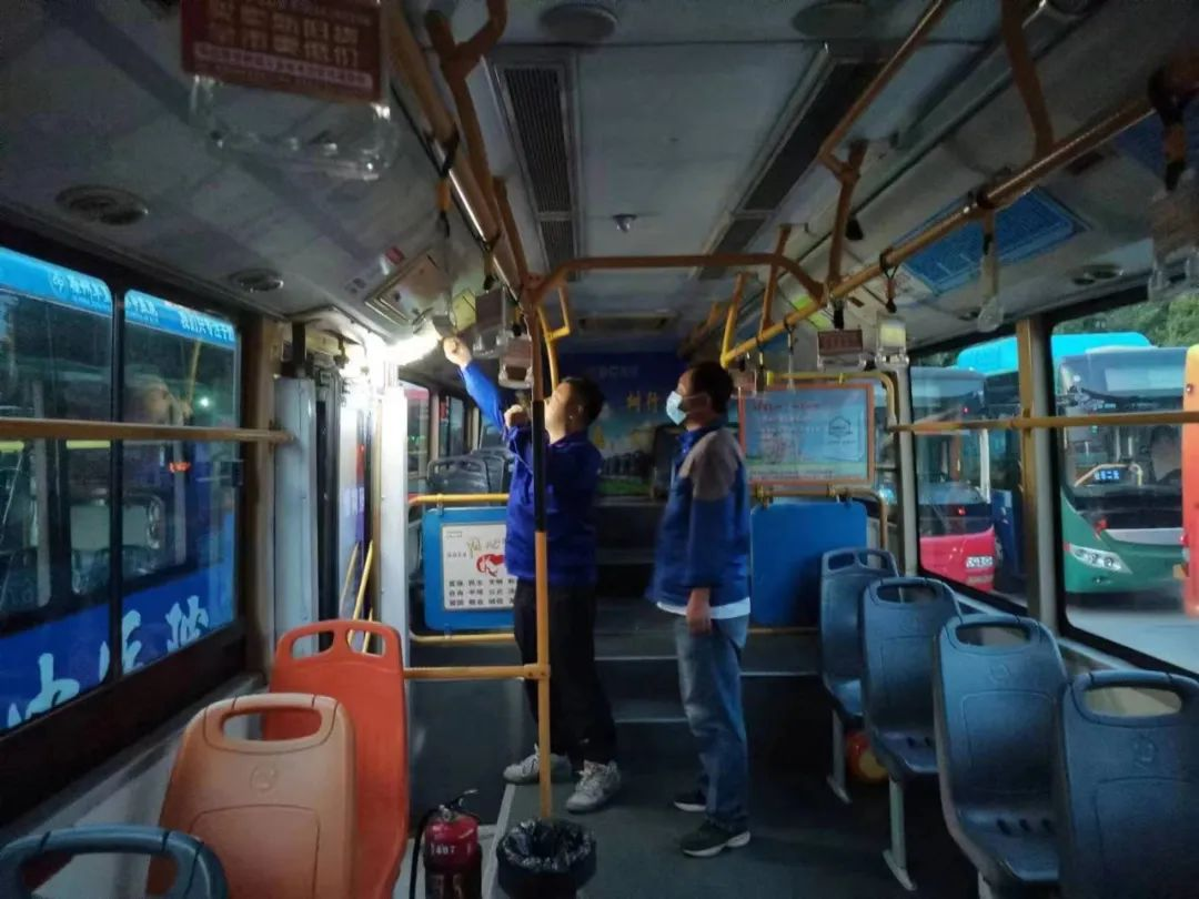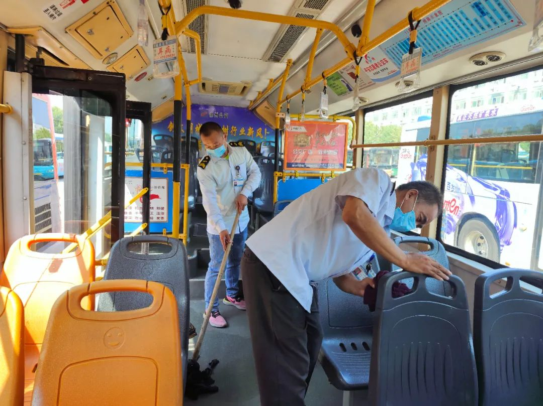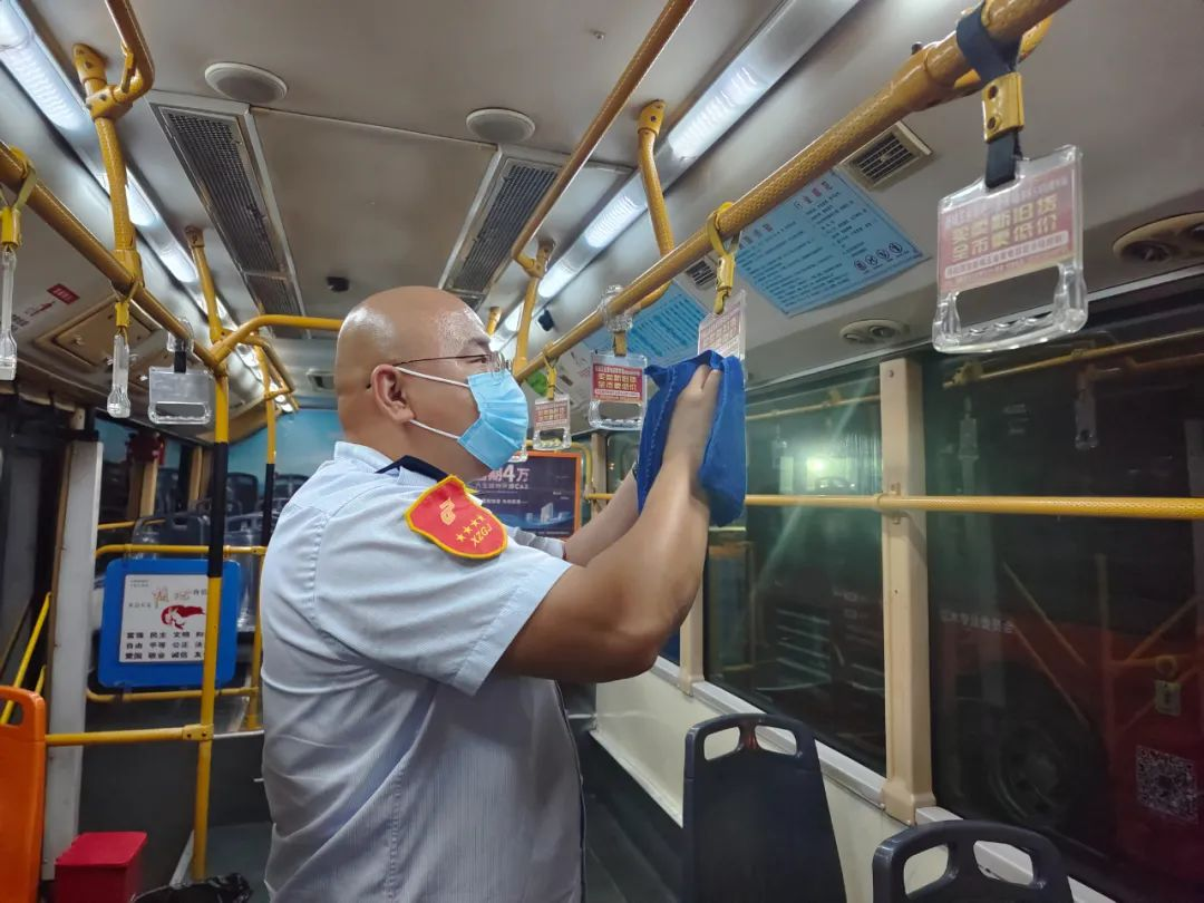 檢修人員在車輛回場后,逐輛進(jìn)行檢修和調(diào)試,確保第二天能順利出車。而駕駛員宗浩一絲不茍地做著消毒工作,“雖然下班收車了,但現(xiàn)在是國慶節(jié)假期的特殊時期,而且疫情還沒有結(jié)束,如果公交車的消毒沒做好,那就是對乘客不負(fù)責(zé)。”