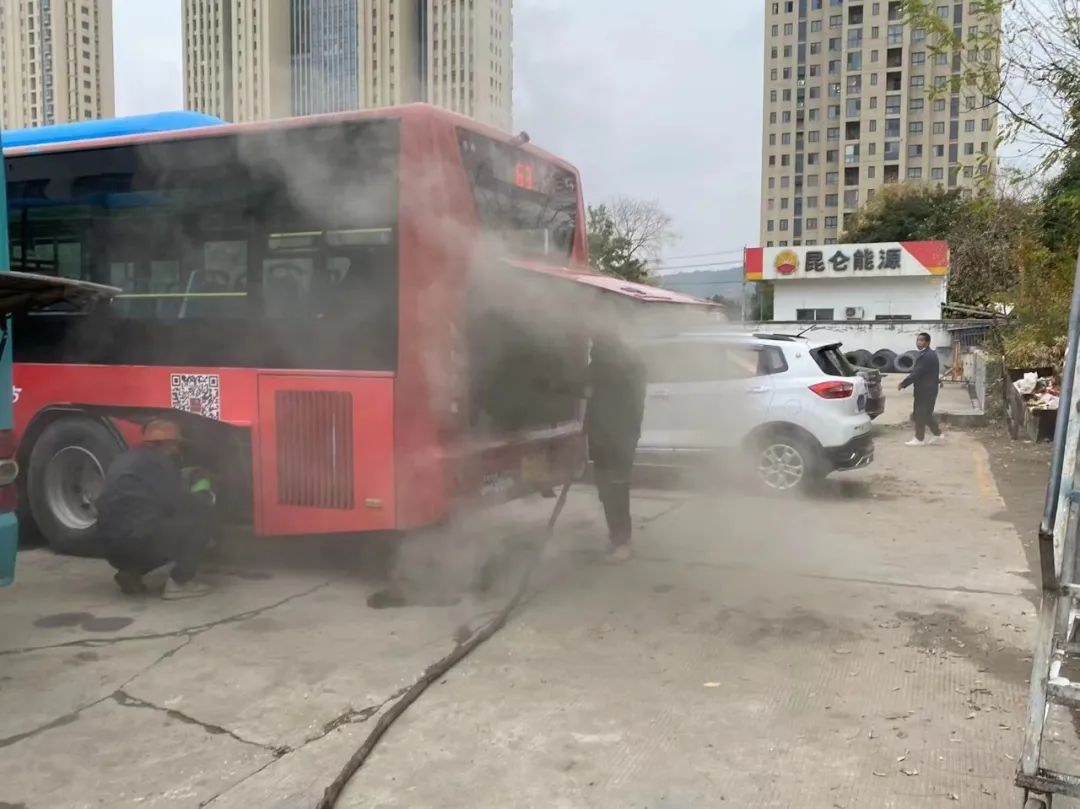 干冰清洗可在不影響營運(yùn)的情況下在線清洗。為增強(qiáng)車輛運(yùn)營效率,縮減空駛里程,節(jié)約集團(tuán)燃料費(fèi)用成本,金通公司協(xié)同施工方前往車輛所停的車場,利用車輛休停時(shí)間分批次清洗,修理人員現(xiàn)場協(xié)助,確保清洗質(zhì)量。