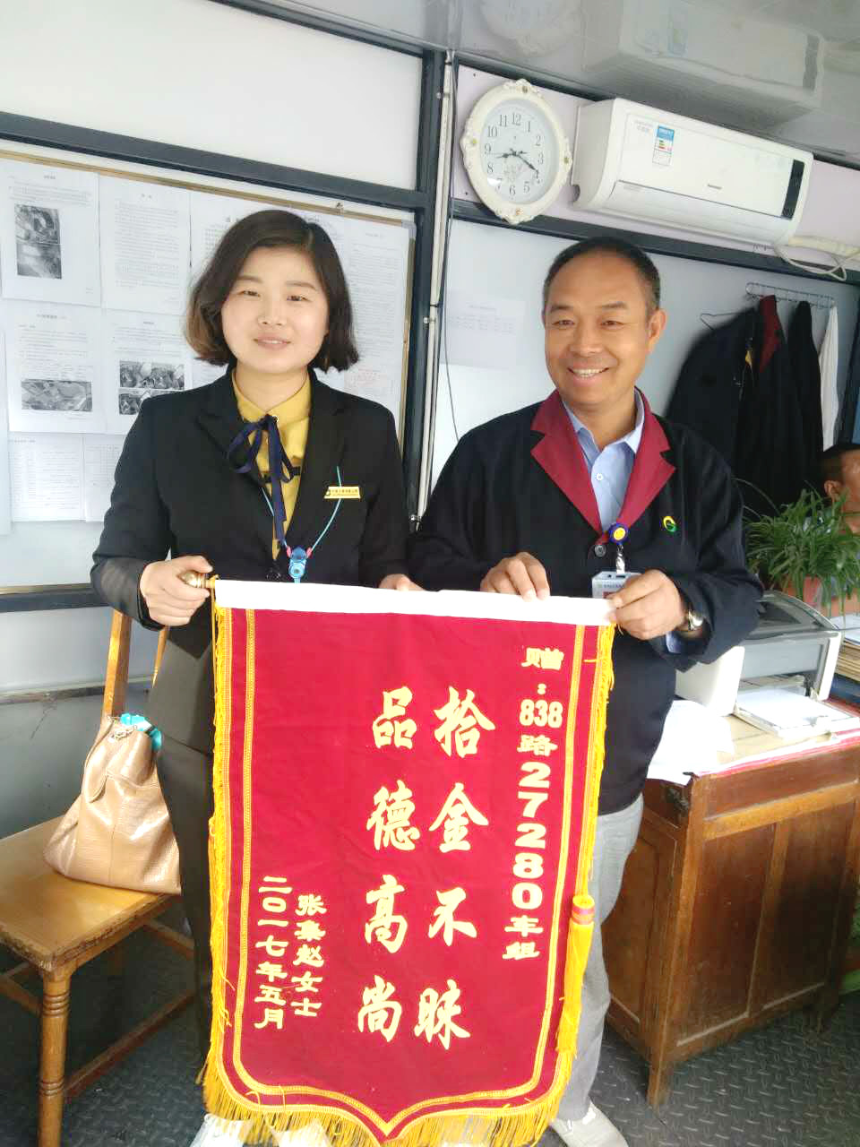 5月9日上午8:30左右,乘客趙女士帶著寫有“拾金不昧品德高”的錦旗,乘坐838路公交車趕到公交宣武車站調度室,雙手將錦旗交到站長助理梁昌明手里。