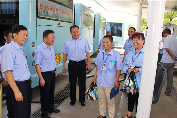 炎炎烈日下,空調(diào)公交車成為市民出行首選。為給市民營造舒適、涼爽的乘車環(huán)境,各運(yùn)營公司應(yīng)用公交GPS智能調(diào)度系統(tǒng),科學(xué)調(diào)度、靈活排班、保證運(yùn)力充足。同時,結(jié)合創(chuàng)建工作,提高服務(wù)質(zhì)量,全市2100多輛空調(diào)車全部開足冷氣;駕乘人員揮汗如雨堅(jiān)持“一趟一清掃”,認(rèn)真做好車輛清潔工作;督導(dǎo)隊(duì)員冒著高溫在各大站臺維持秩序、扶老攜幼、做好導(dǎo)乘服務(wù)、嚴(yán)查易燃易爆及危險(xiǎn)品。由于各項(xiàng)舉措落實(shí)到位,確保了高溫期間全市161條公交線路運(yùn)營順暢,乘客走好走了。(圖為董事長、總經(jīng)理杜紅軍,總經(jīng)理助理李修超一行在食品城充電站慰問堅(jiān)守崗位的充電員工。)